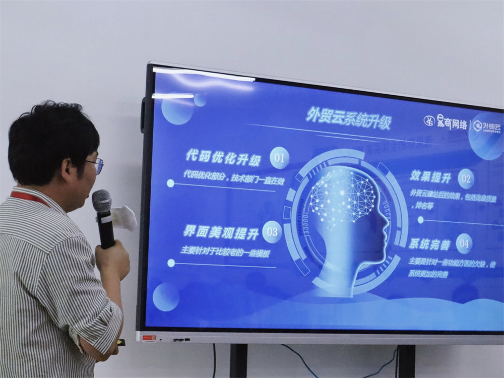 随后技术部总监对本部门工作做了详细的下半年工作计划,重点突出了代码优化升级、界面美观提升、社交营销系统升级、AI询盘挖掘系统升级等等改进方案